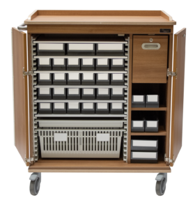 Deze medicijnwagens zijn zeer geschikt voor het Baxter systeem. Ook voor andere wijze van organiseren zijn deze medicijnwagens in te zetten. De wagens bieden zeer veel capaciteit, te weten 9 tot 36 medicijnlades, desondanks blijven de wagens compact en handelbaar. Per bewoner / cliënt een separaat uittrekbare medicijnlade (3 of 4,5 liter inhoud), Baxterrol en zo nodig medicatie zitten in dezelfde lade, wat weer de kans op fouten minimaliseert. Onderin de medicijnwagens worden soft-closing bulklades van 30 en/of 50 liter geplaatst, afhankelijk van het model.